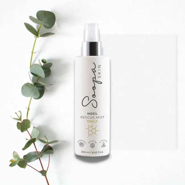 Introducing Soopa Skin HOCl Rescue Mist Daily, a fine spray-mist featuring HOCl (Hypochlorous Acid) to preserve the skin’s micro-biome and provide soothing, purifying, and rejuvenating benefits for fragile, irritated, and environmentally stressed skin.